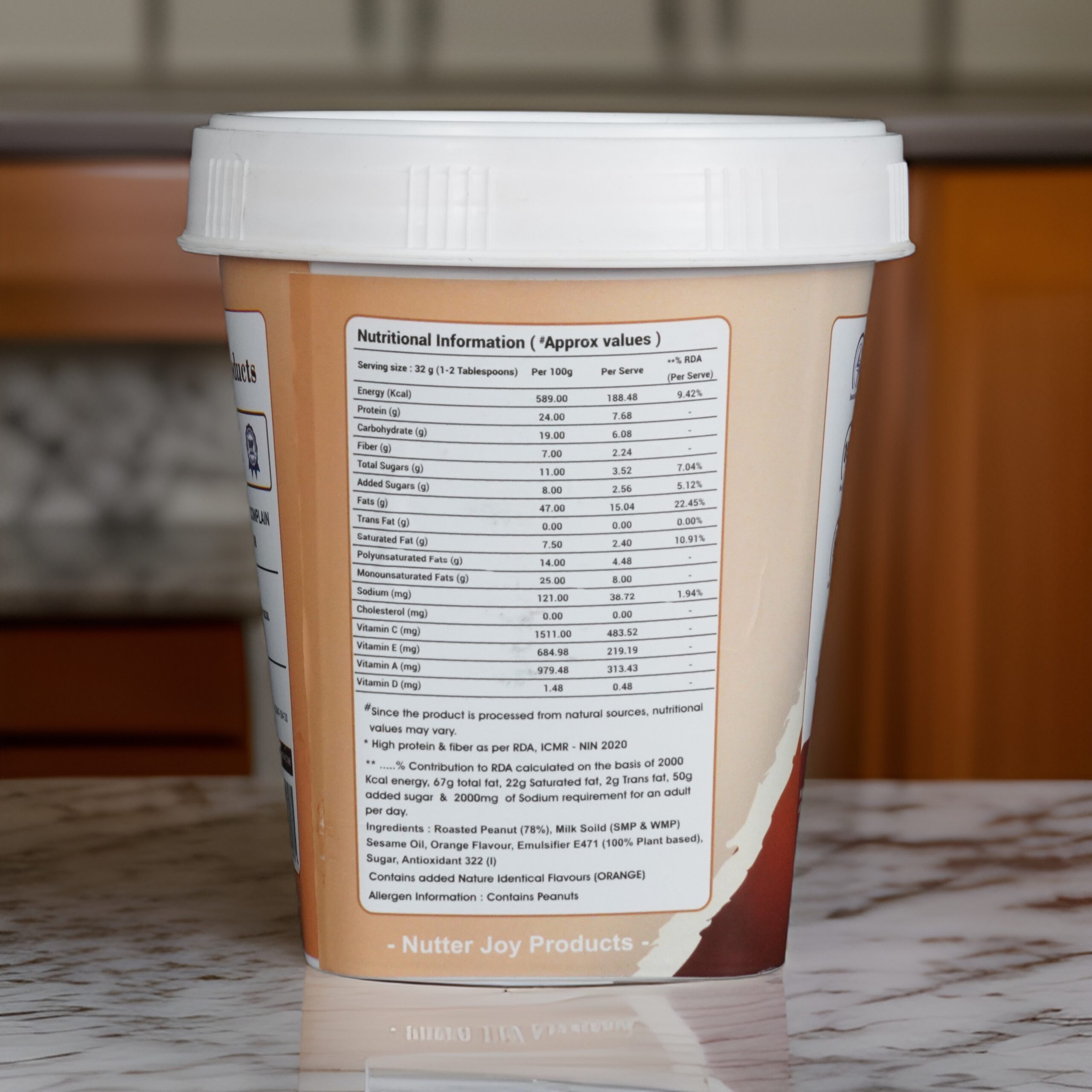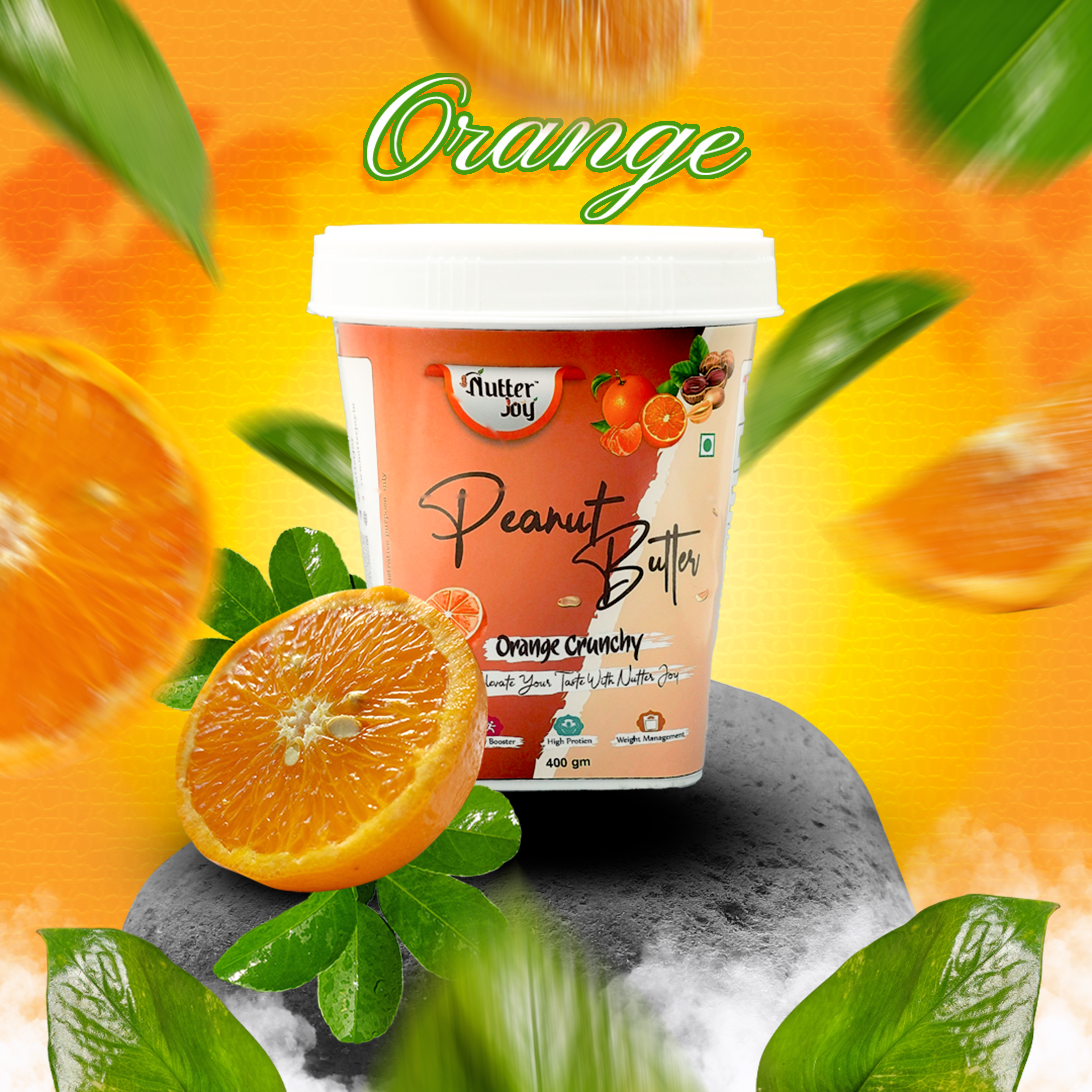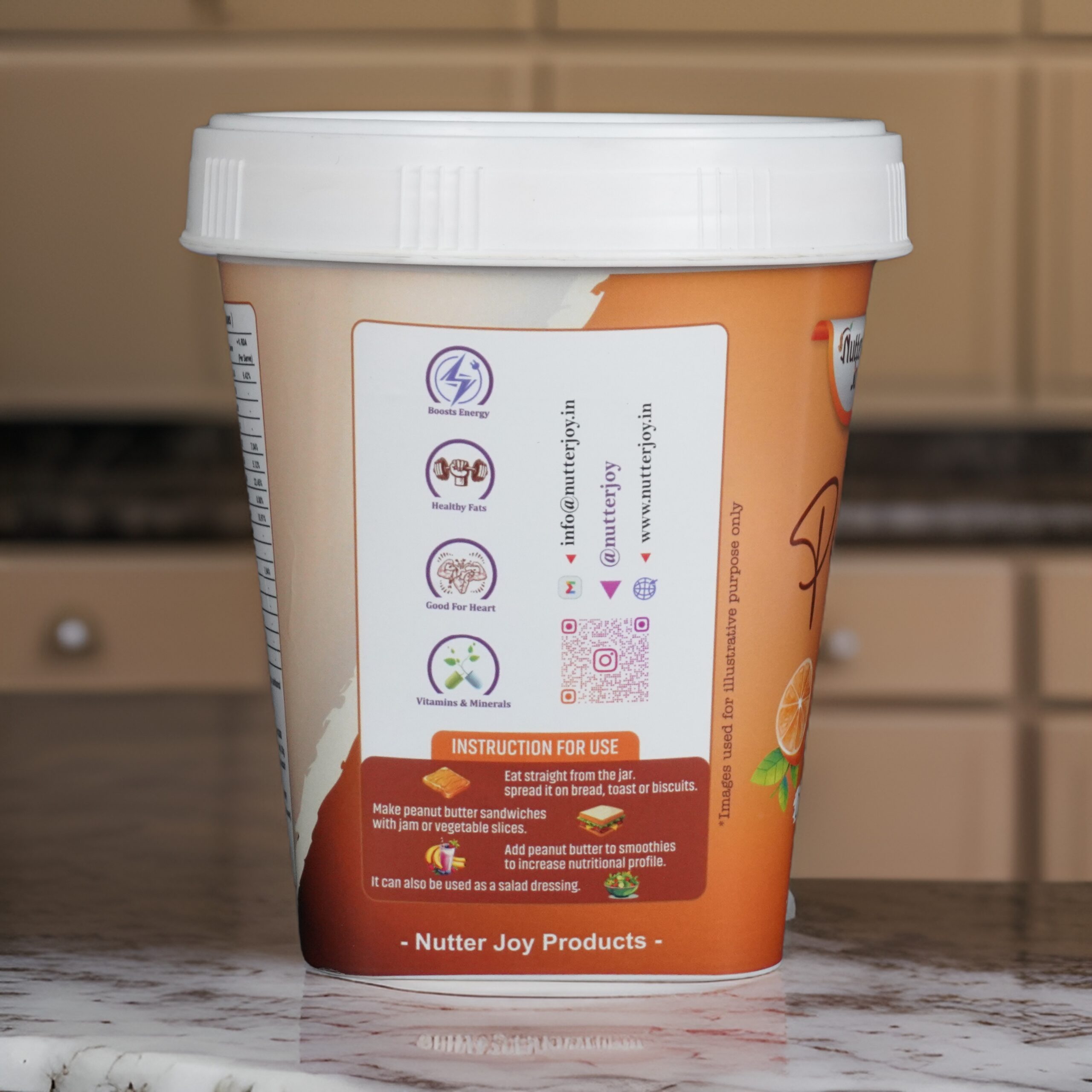 Nutter Joy Orange Crunchy Peanut Butter offers a unique taste adventure. The initial tangy sweetness of orange beautifully melds with the savory crunch of peanuts, creating a harmony of flavors that is both bold and refreshing.